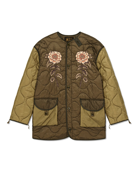Giacca interna oversize con ampio ricamo semilucido sul retro e sul petto. Il capo presenta una chiusura centrale anteriore con bottoni in corozo e tasche inferiori a soffietto con tirante in fettuccia di cotone e chiusura con bottoni in corozo. Cuciture con bordino in nylon a contrasto, dettagli con linguetta in nylon vintage replicati. Realizzato in nylon ripstop imbottito con maniche e tasche a contrasto.
