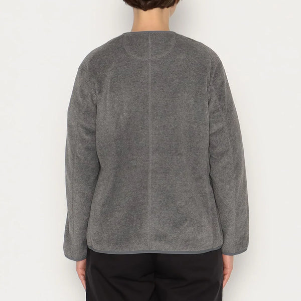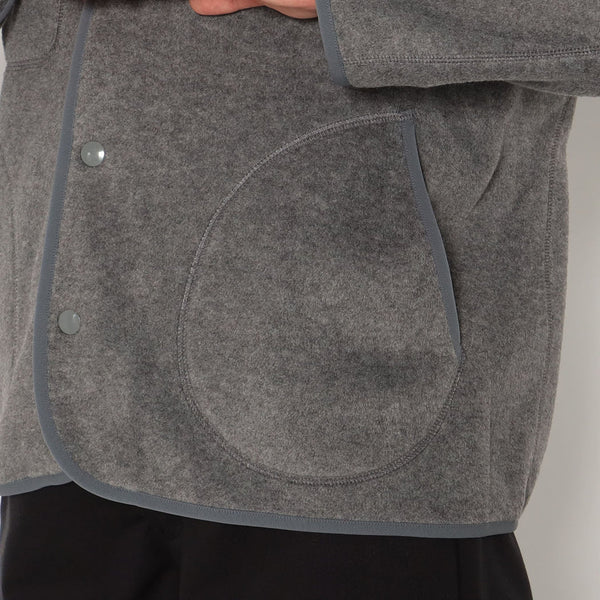 Pile spazzolato su entrambi i lati. Texture morbida e soffice, tipica di una miscela di poliestere e rayon. Chiusura frontale con bottoni automatici.