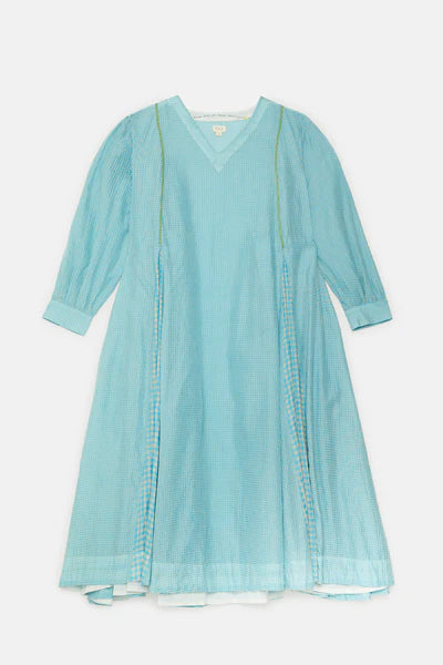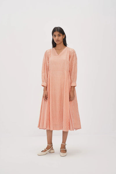 Realizzato in un pregiato blend di cotone (60%) e seta (40%), questo abito midi presenta maniche a sbuffo e una costruzione a pannelli che valorizza il movimento e la struttura del capo. Confezionato in tessuto a quadri handwoven in cotone e seta, il design è impreziosito da dettagli a contrasto sul bordo (selvage) che ne sottolineano la qualità artigianale.