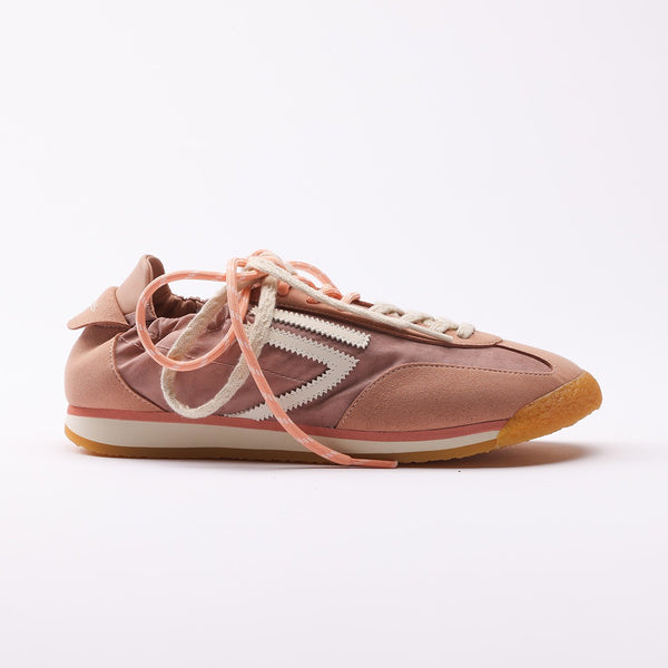 Nylon e microsuede rosa antico con logo bianco sporco e dettagli rosa antico. Suola rosa, beige chiaro e miele, doppi lacci rosa e beige chiaro .