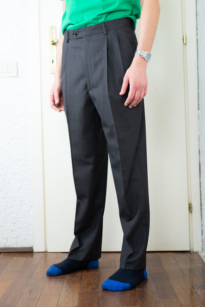 Pantalone Gessato marrone con riga rossa in fresco lana, modello classico con pencies, gamba larga.