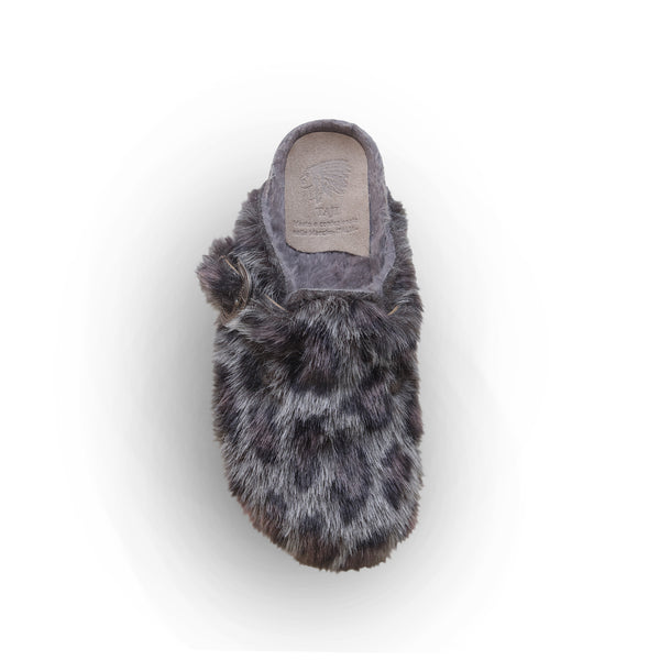 Sabot con 1 fibbia, tomaia in eco-pelliccia melange leopardo grigio e suola anatomica foderata in eco-pelliccia color panna.